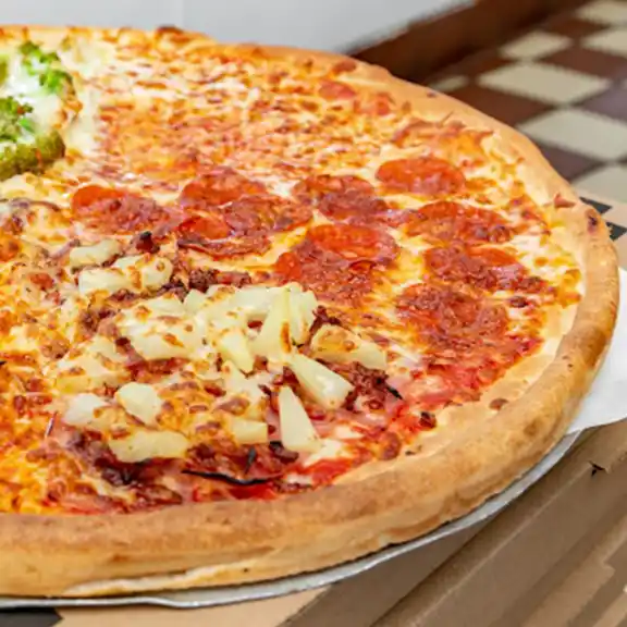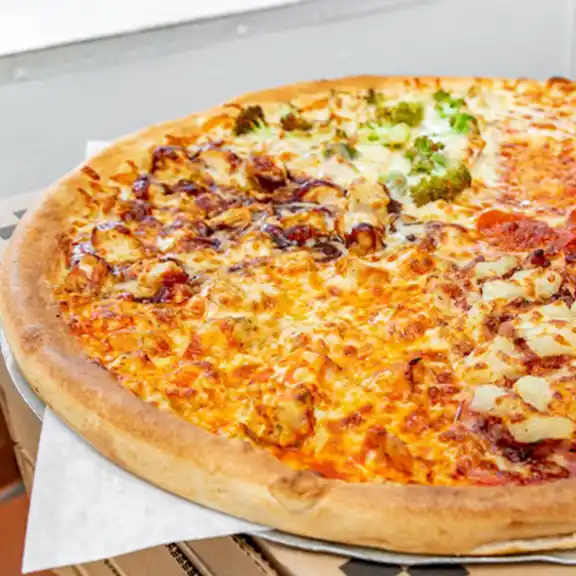 When it comes to finding delicious Hawaiian Pizza in Dorchester, this is it! Our Hawaiian is made with savory ham, crispy bacon, and sweet pineapple, baked on our tasty pizza crust with a thin layer of marinara, topped with a generous layer of melty cheese! What's not to love?
